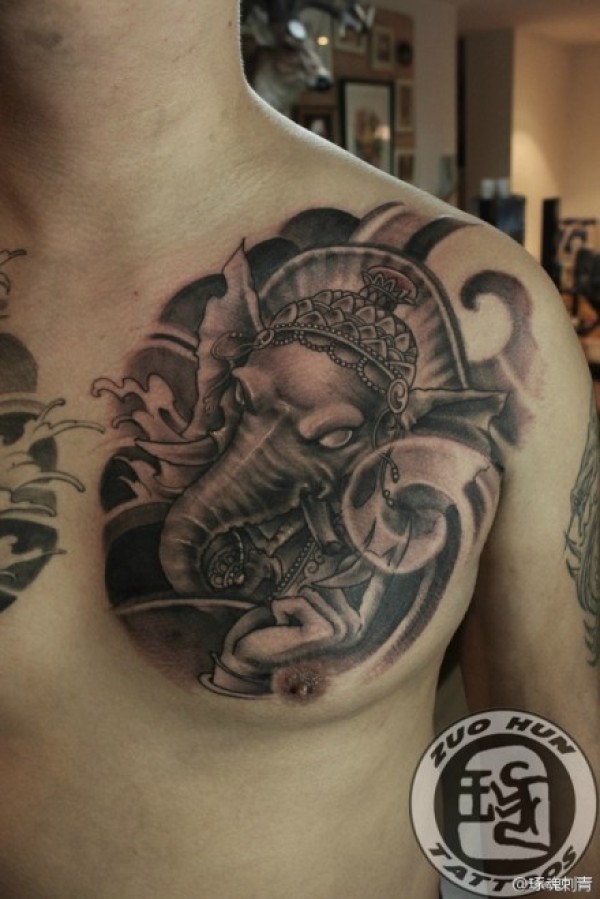胸前经典很酷的黑灰象神纹身图案_胸部纹身图案大全_纹身图吧