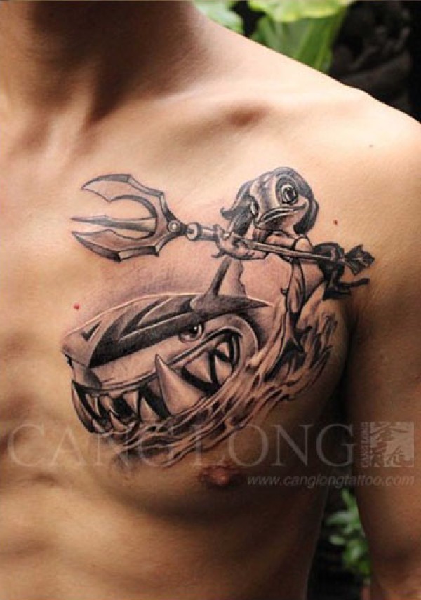男人胸前一款经典的小鱼人纹身图案_胸部纹身图案大全_纹身图吧