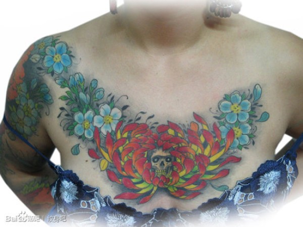 美女胸前潮流精美的菊花纹身图案_胸部纹身图案大全_纹身图吧