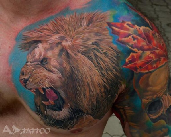 男人胸前超酷的彩色狮头纹身图案_胸部纹身图案大全_纹身图吧