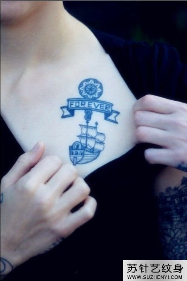 胸前蓝色帆船纹身_胸部纹身图案大全_纹身图吧