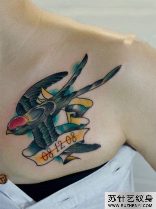 胸前彩色小燕子纹身_胸部纹身图案大全_纹身图吧