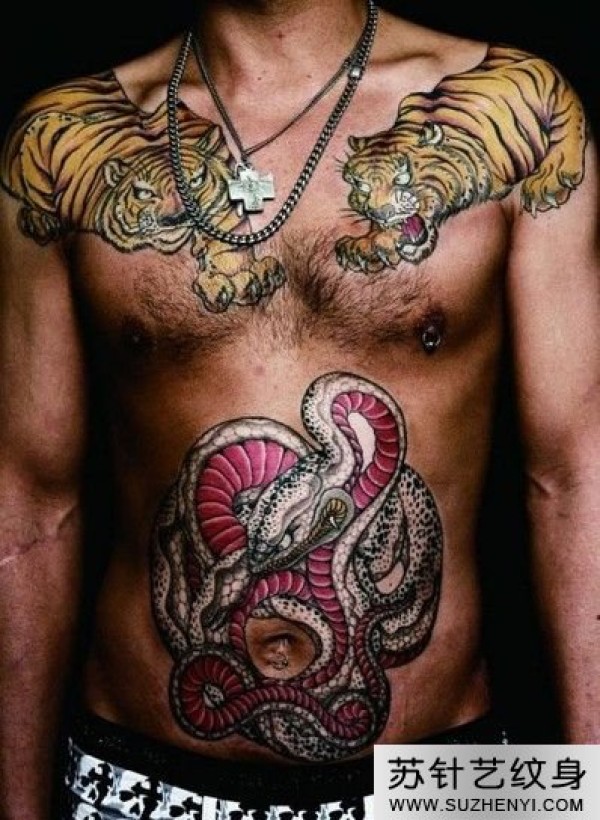 胸前老虎蛇对战纹身_胸部纹身图案大全_纹身图吧