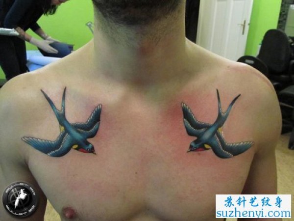 胸部彩色小燕子纹身_胸部纹身图案大全_纹身图吧