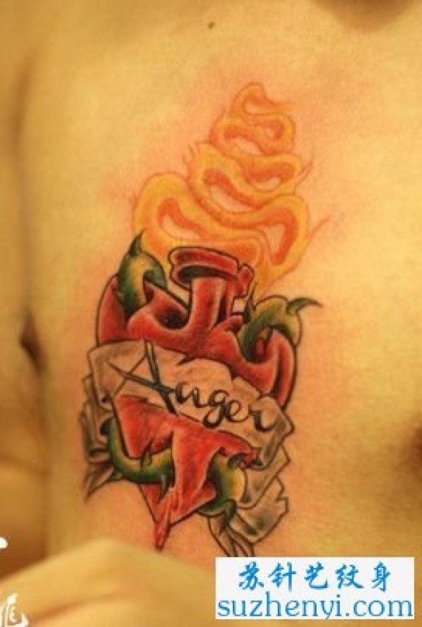 胸部彩色爱心与火焰纹身_胸部纹身图案大全_纹身图吧