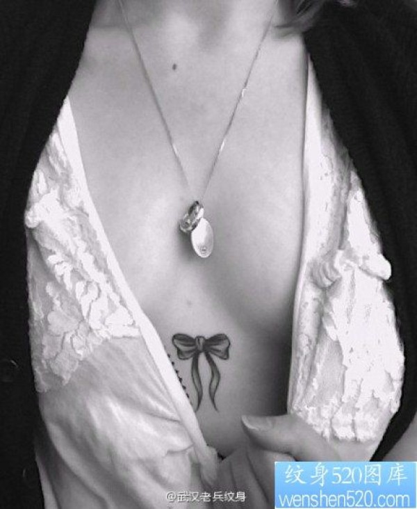 女人小清新胸部蝴蝶结文身作品_小清新纹身图案大全_纹身图吧