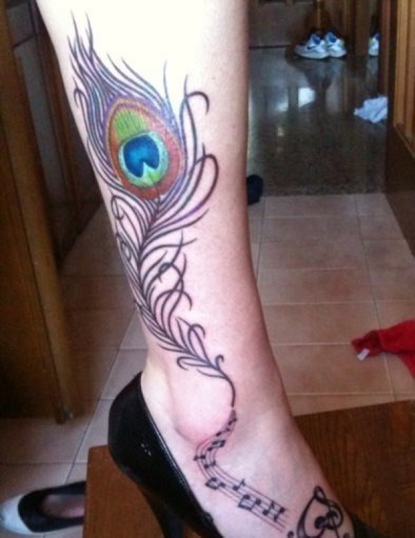 小腿部到脚踝的漂亮孔雀羽毛纹身_小清新纹身图案大全_纹身图吧