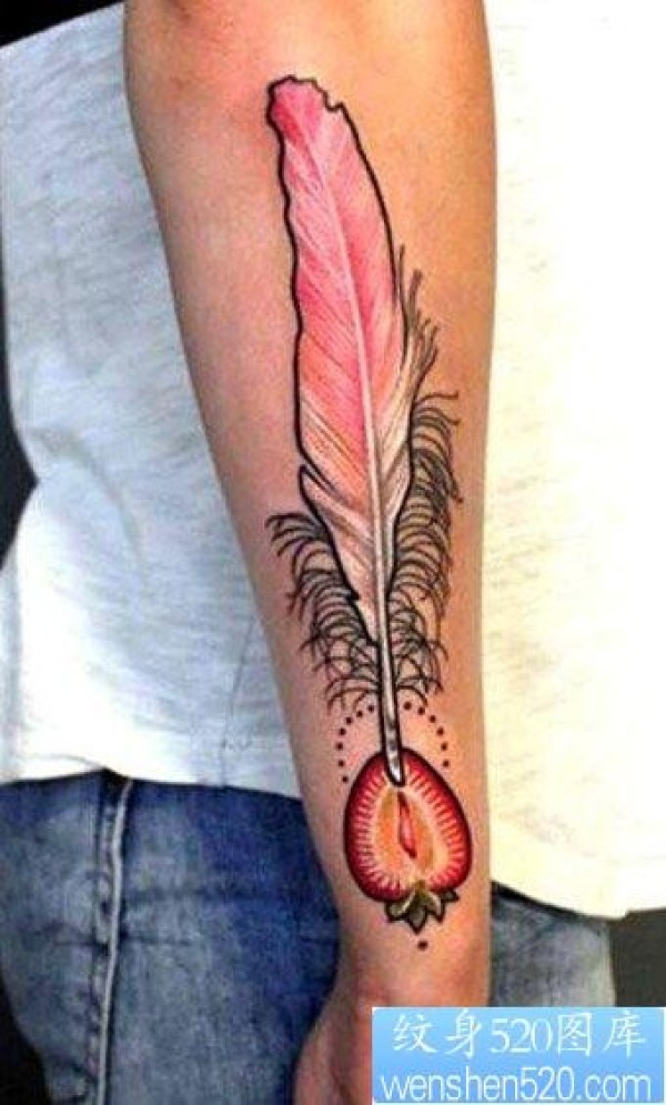 手臂上一幅粉红羽毛纹身图片_小清新纹身图案大全_纹身图吧