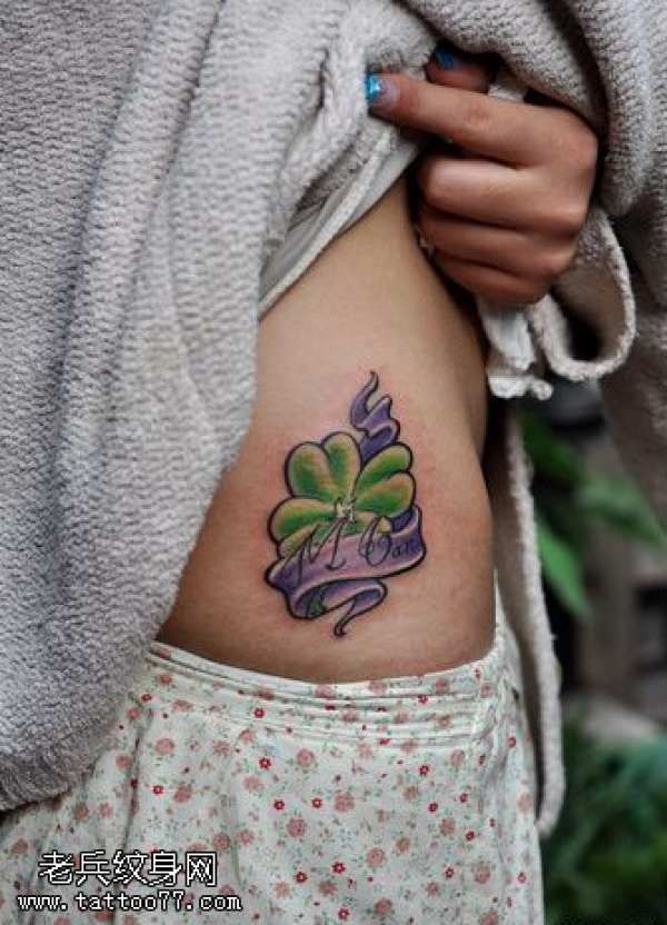 小清新侧腰四叶草飘带纹身图案_小清新纹身图案大全_纹身图吧