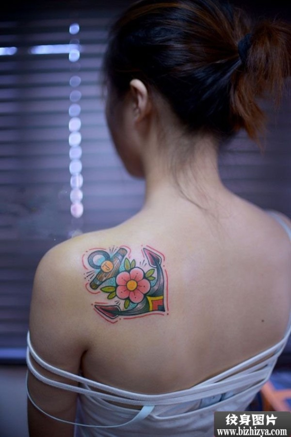 清新樱花船锚后肩纹身图案图片_小清新纹身图案大全_纹身图吧