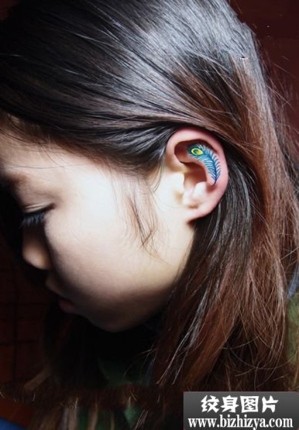 美女耳朵时尚孔雀羽毛图案图片_小清新纹身图案大全_纹身图吧