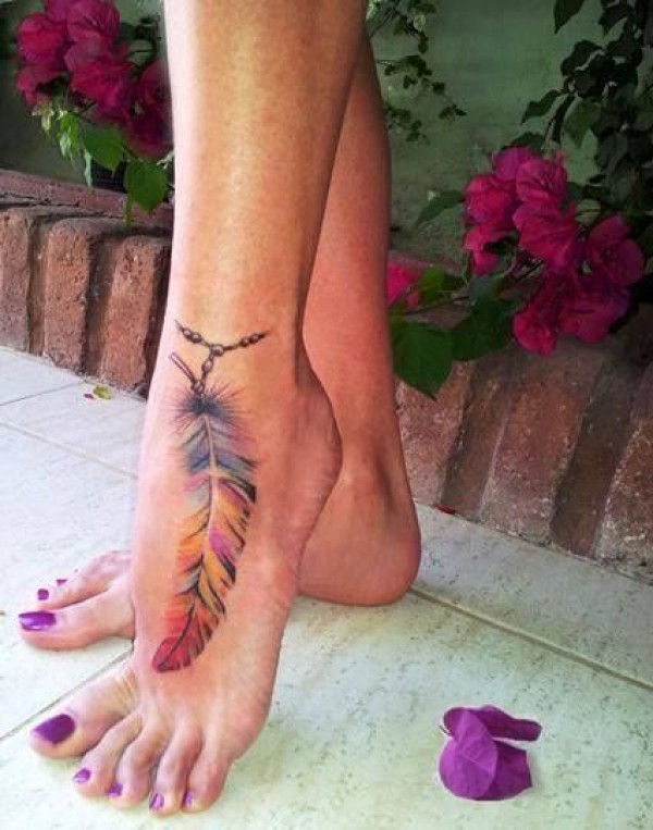 脚背彩色小羽毛纹身_小清新纹身图案大全_纹身图吧