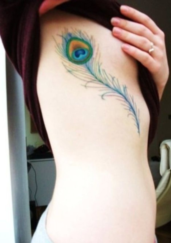 美女侧腰一款时尚唯美的羽毛纹身图案_小清新纹身图案大全_纹身图吧
