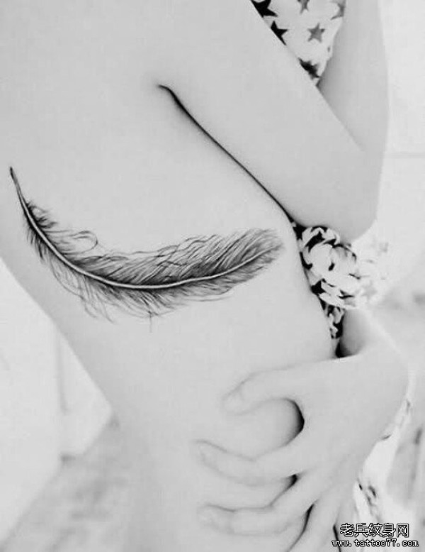 分享一款美女侧腰羽毛纹身图案_小清新纹身图案大全_纹身图吧