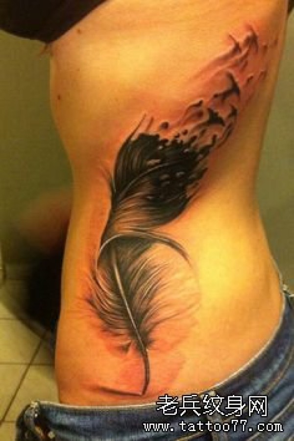 推荐一款侧腰黑灰羽毛纹身图案_小清新纹身图案大全_纹身图吧