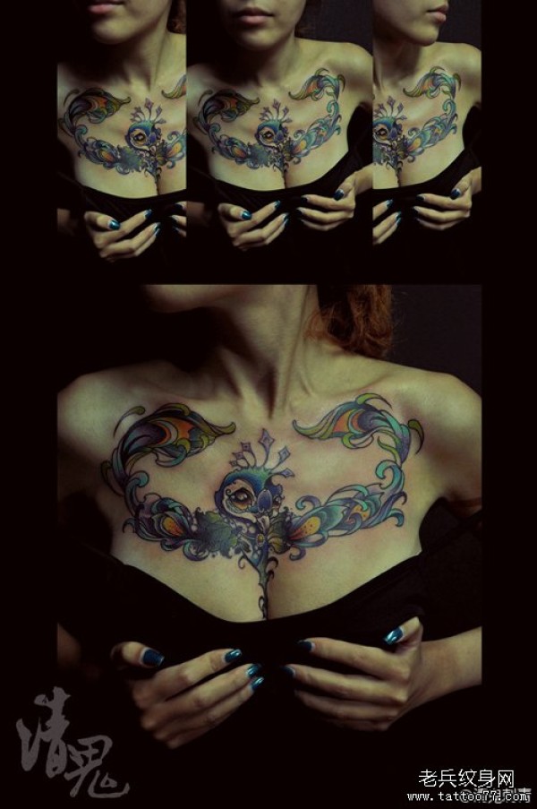 胸部好看的孔雀羽毛纹身_小清新纹身图案大全_纹身图吧