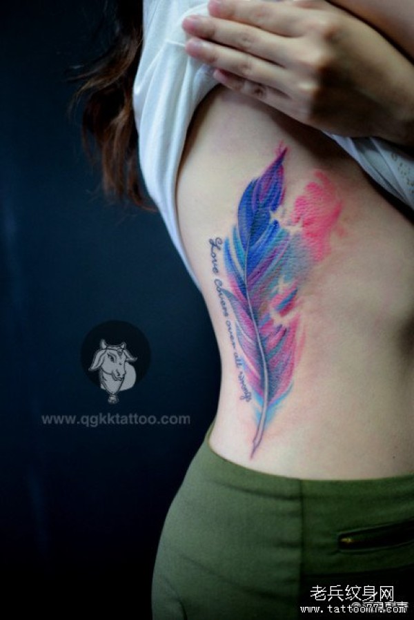 美女侧腰好看漂亮的彩色羽毛纹身图案_小清新纹身图案大全_纹身图吧
