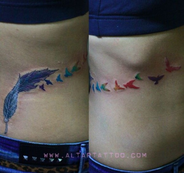 美女腰部羽毛与彩色小鸟纹身图案_小清新纹身图案大全_纹身图吧