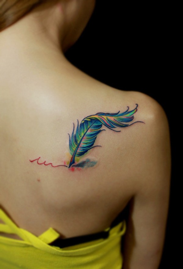 美女肩背漂亮时尚的彩色羽毛纹身图案_小清新纹身图案大全_纹身图吧