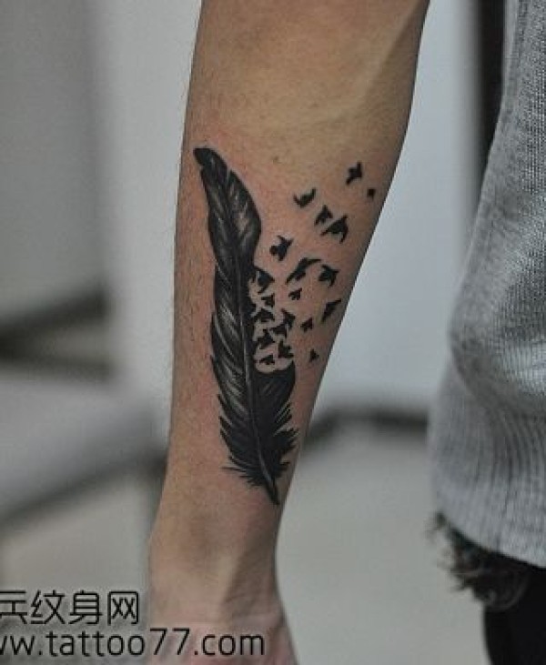 男生手臂一款羽毛化小鸟纹身图案_小清新纹身图案大全_纹身图吧