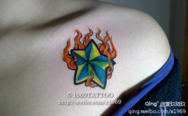 女孩子锁骨处彩色五芒星火焰纹身图案_小清新纹身图案大全_纹身图吧