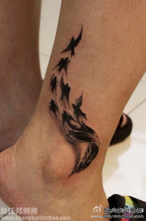 腿部羽毛小鸟纹身图案纹身图片_小清新纹身图案大全_纹身图吧