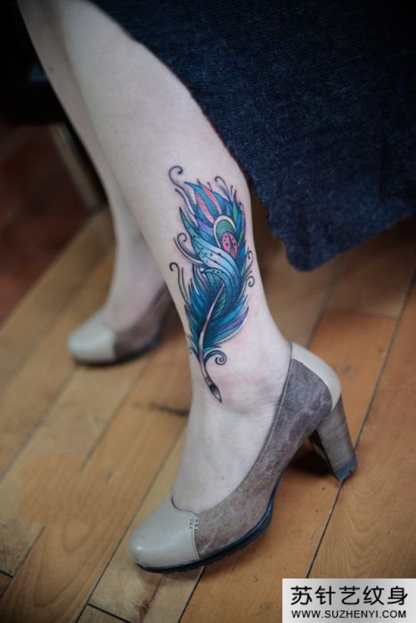 炫彩羽毛脚个性踝纹身_小清新纹身图案大全_纹身图吧