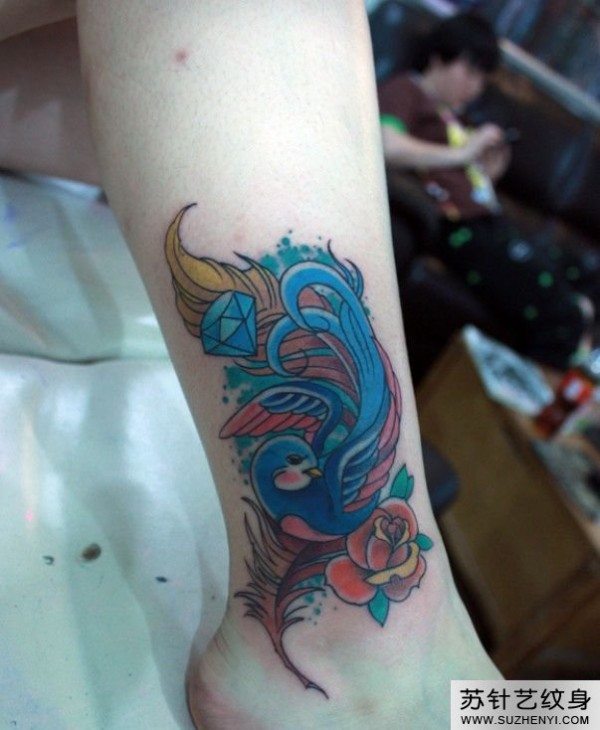 脚背彩色小羽毛纹身_小清新纹身图案大全_纹身图吧