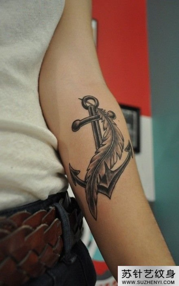 手臂羽毛锚刺青图_小清新纹身图案大全_纹身图吧