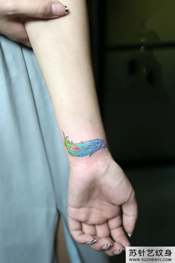 蓝色羽毛手腕纹身_小清新纹身图案大全_纹身图吧