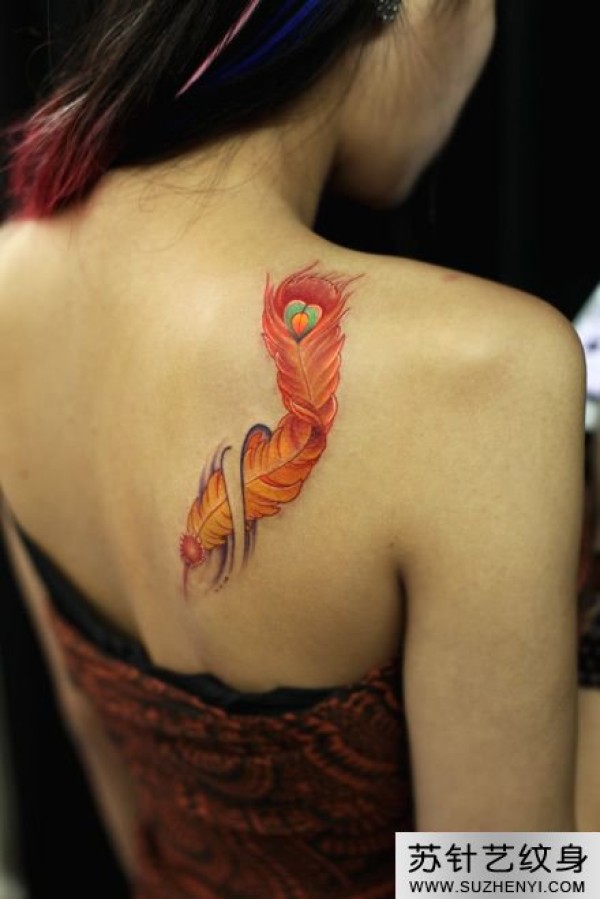 后肩红色羽毛刺青图案_小清新纹身图案大全_纹身图吧