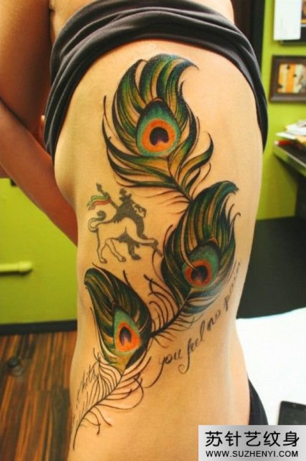 腰部孔雀羽毛纹身_小清新纹身图案大全_纹身图吧