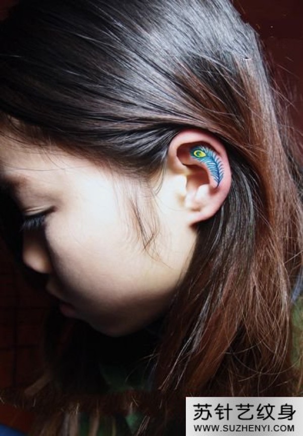 耳朵时尚孔雀羽毛纹身_小清新纹身图案大全_纹身图吧