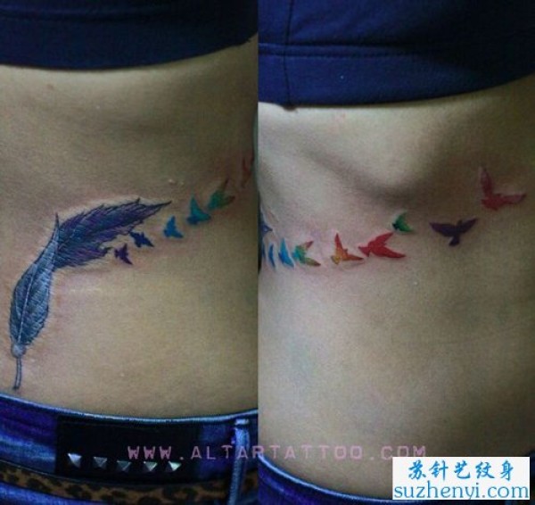 腹部彩色羽毛纹身_小清新纹身图案大全_纹身图吧