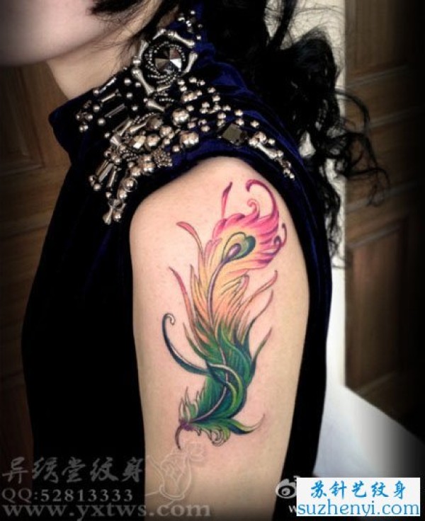 时尚精美的美女手臂彩色羽毛纹身图片_小清新纹身图案大全_纹身图吧