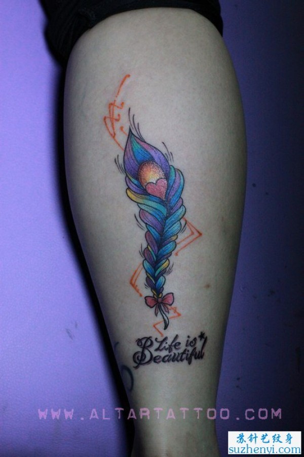 腿部精美的彩色羽毛纹身图案_小清新纹身图案大全_纹身图吧