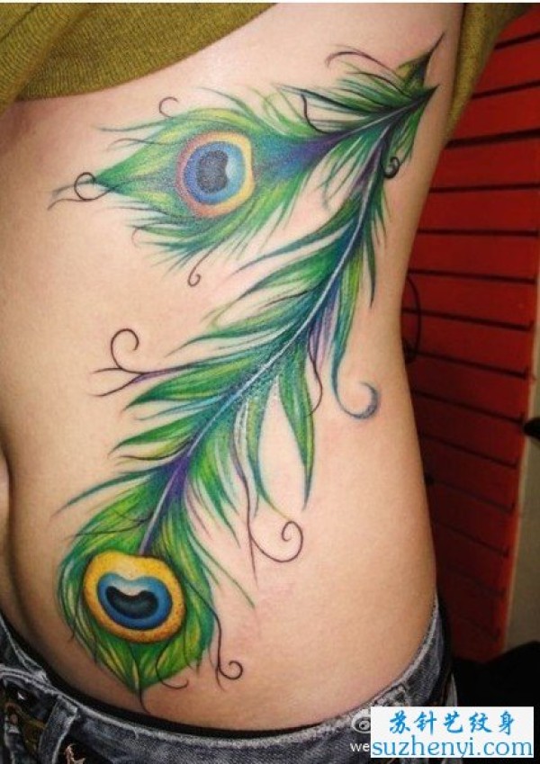 腹部时尚漂亮的孔雀羽毛纹身图片_小清新纹身图案大全_纹身图吧