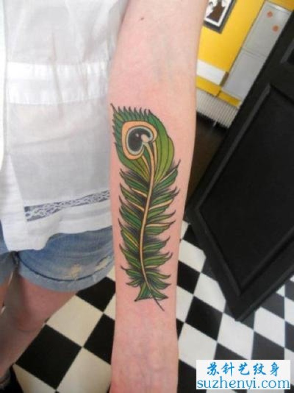 手臂彩色孔雀羽毛纹身图案_小清新纹身图案大全_纹身图吧