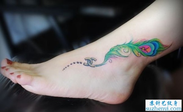 脚部精美的彩色羽毛纹身图案_小清新纹身图案大全_纹身图吧