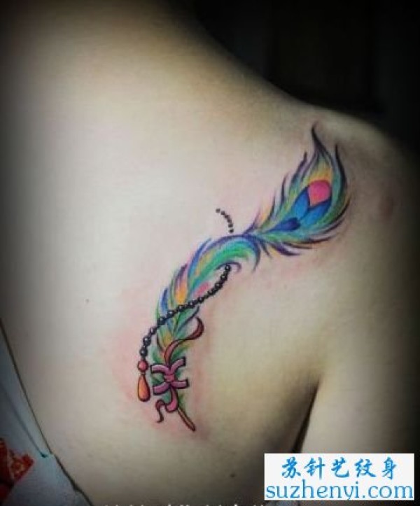 肩背漂亮的彩色羽毛纹身图案_小清新纹身图案大全_纹身图吧