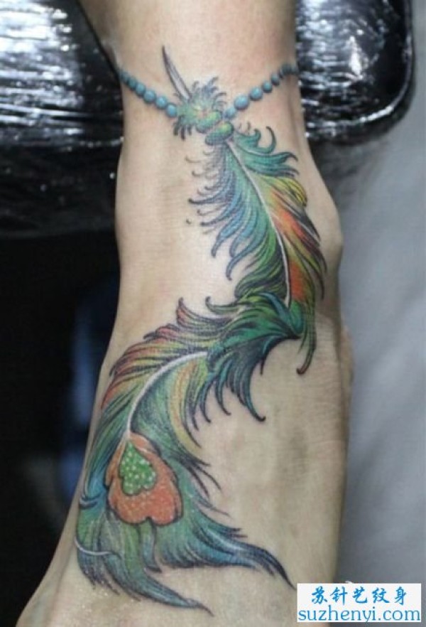 脚背彩色小羽毛纹身_小清新纹身图案大全_纹身图吧