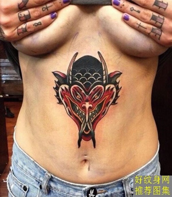 肚子上诡异的怪兽头颅纹身彩色的怪兽头像纹身_肖像纹身图案大全_纹身图吧