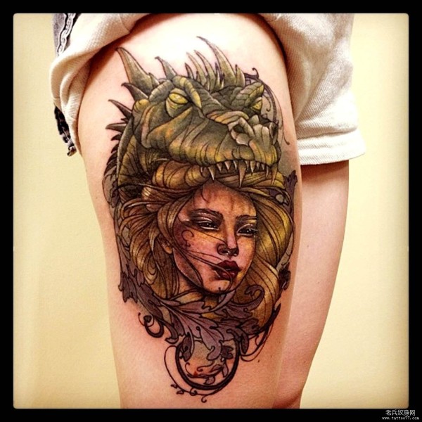 大腿上一款性感时尚的人物肖像纹身图案_肖像纹身图案大全_纹身图吧