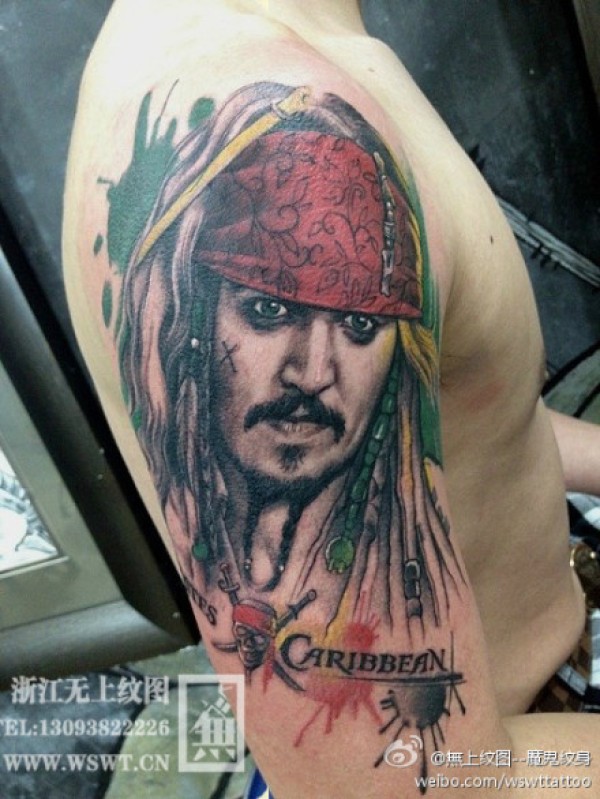 手臂时尚很帅的加勒比海盗杰克船长肖像纹身图_肖像纹身图案大全_纹身图吧