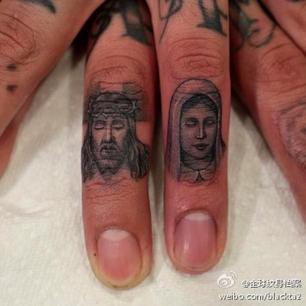 手指小巧经典的耶稣与圣母肖像纹身图案_肖像纹身图案大全_纹身图吧