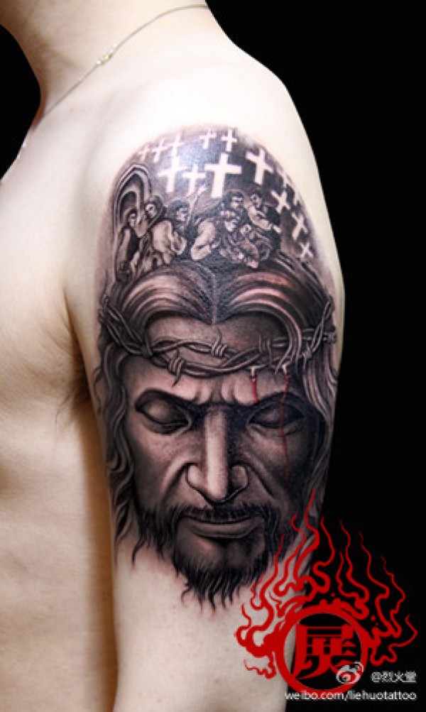 手臂一款经典写实的耶稣肖像纹身图案_肖像纹身图案大全_纹身图吧