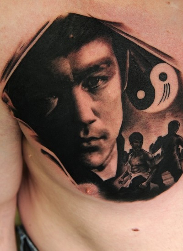 胸部李小龙头像肖像纹身图案纹身图片_肖像纹身图案大全_纹身图吧