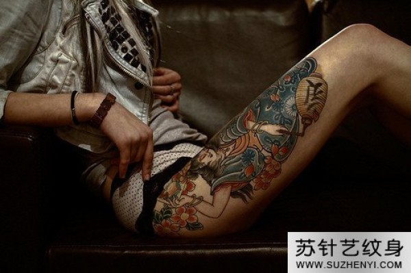 大腿上一款性感时尚的人物肖像纹身图案_肖像纹身图案大全_纹身图吧