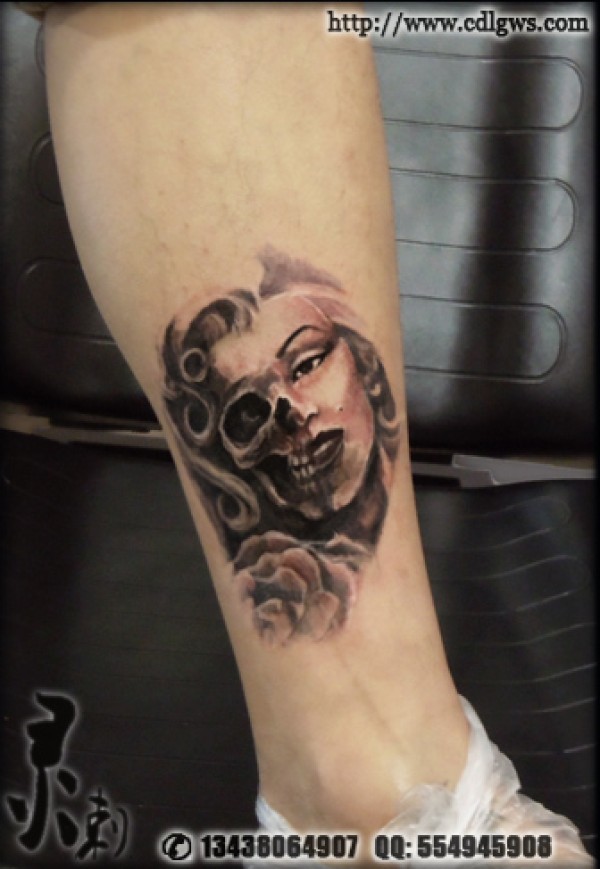 大腿上一款性感时尚的人物肖像纹身图案_肖像纹身图案大全_纹身图吧
