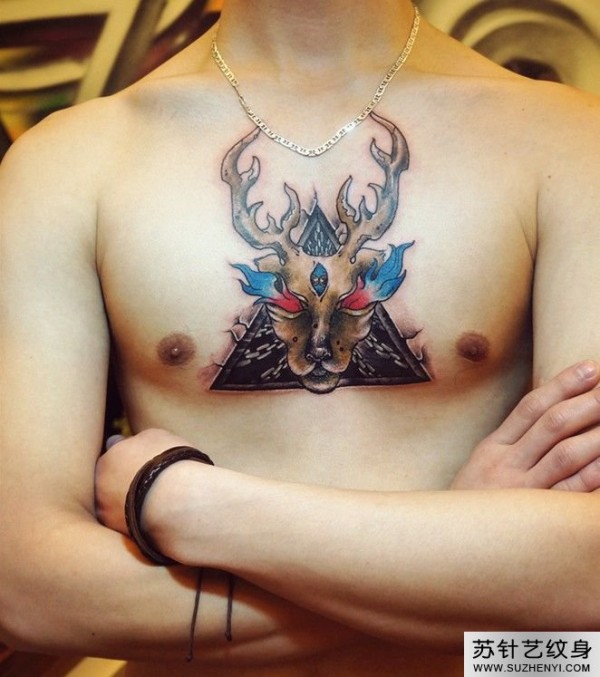 胸口三角麋鹿头像纹身_肖像纹身图案大全_纹身图吧